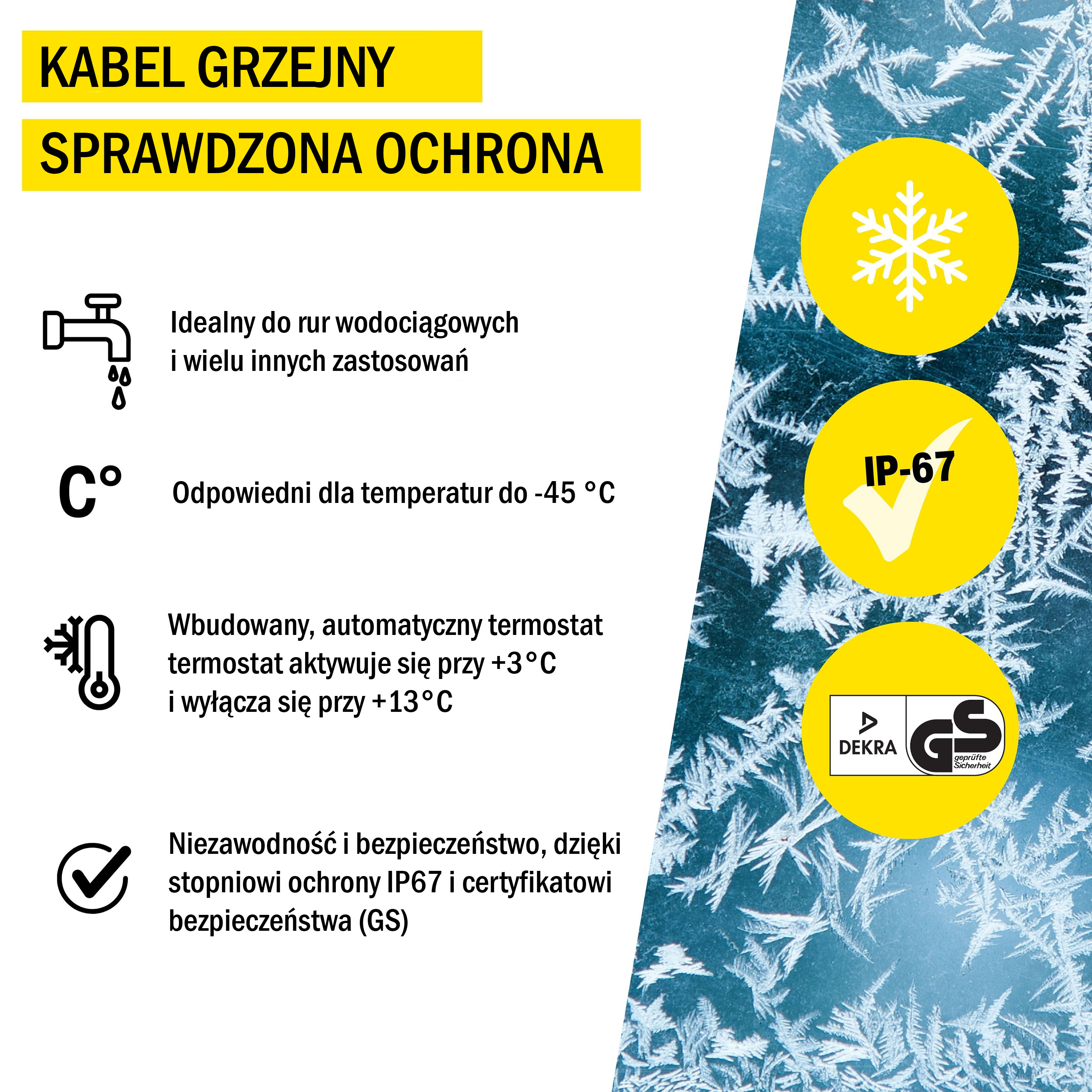 Przewody grzejne posiadają wbudowany termostat, który mierzy temperaturę. Włącza się przy +3°C i wyłącza przy +13°C. Dodatkowa izolacja chroni rurę wodną przed zamarzaniem do temperatury -45°C. Ważne jest, aby termostat również był odpowiednio zaizolowany. Kabel grzejny zasilany napięciem 230 V oferuje moc od 17 do 768 W.
